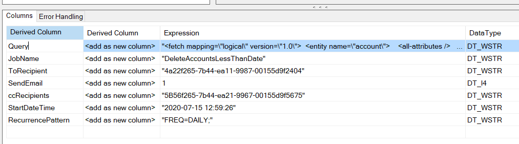The BulkDelete action requires a FetchXML to query the records targeted for deletion. This query can be a string in the “BulkDeleteQuery” field of our CRM Destination component. The recommended approach to do this would be by using a Derived Column component. Before we proceed with our example, let’s take a look at what are the fields that are exposed (both required and optional) for BulkDelete action.