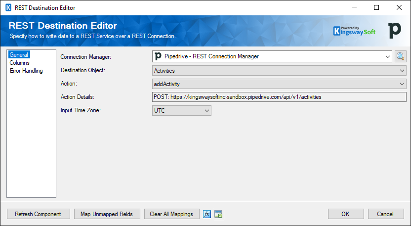 The REST Destination Component is an SSIS data flow pipeline component that can be used to write data to Pipedrive REST services.